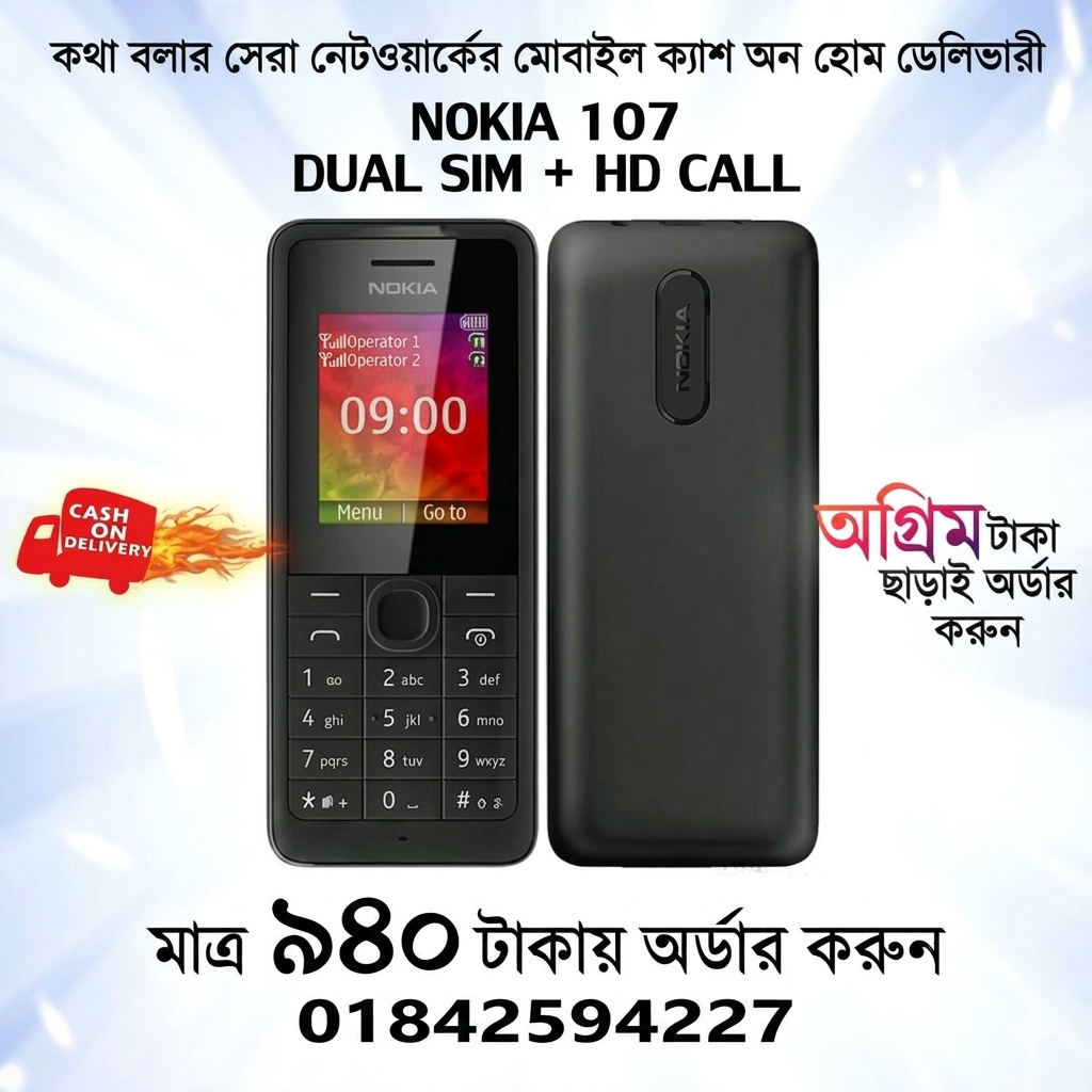 নোকিয়া ১০৭ দুই সিমের মোবাইল এবং এতে মেমোরী কার্ড ব্যবহার করা যায়। দেখতে সাধারন এবং অফিশিয়াল লুকস যে কাউকে মুগ্ধ করবে, স্মার্ট ও সিম্পল ডিজাইন এই মোবাইল এর।